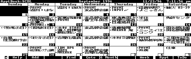 The Japanese language environment displays the complicated Japanese characters in the Palmtop's graphic mode. Shown above are sample screens from Appointment Book (top), DOS (middle) and PhoneBook (bottom).