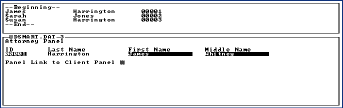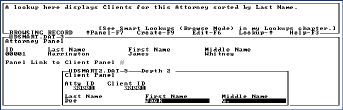 When you use the database, you might look for a particular attorney's name. When you find your Attorney you Tab to the "Panel Link to Client Panel" and then hit Down Arrow to arrive in the Client Panel to view Clients attached to that Attorney or create new ones.