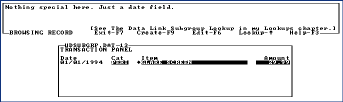Here the user sees a Transaction Panel with the cursor sitting on the Date field. Notice the diamond character attached to the left side of the Item field. That's a data link. A data link is used not so much for navigation from one panel to another (that's the intended function of the panel link); rather, a data link was created to allow for a pick-list lookup display during data entry. The above panel was configured in a way that filters what the user sees in the pick-list lookup display. The pick-list lookup display will display records seen in the linked Item Panel but filter them to conform to what was entered in the Category field to the left.