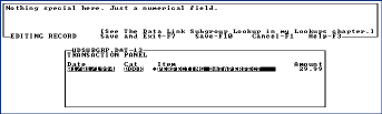 Notice that the Item and Price fields are now filled in. The cursor in this case is in the Amount field. The relation feature just saved the user a lot of typing and eliminated a lot of potential data entry errors.