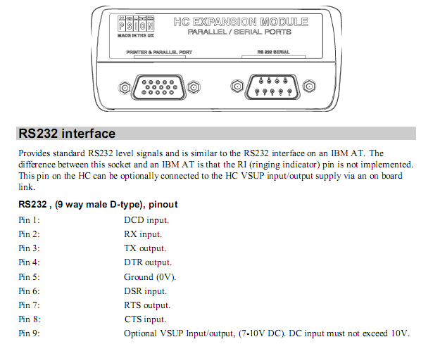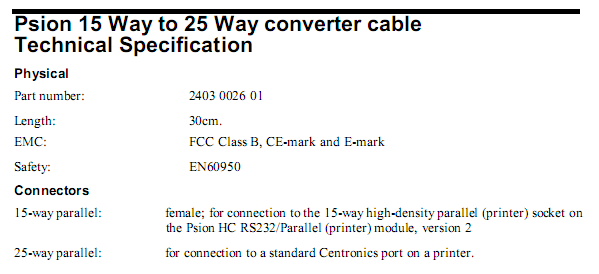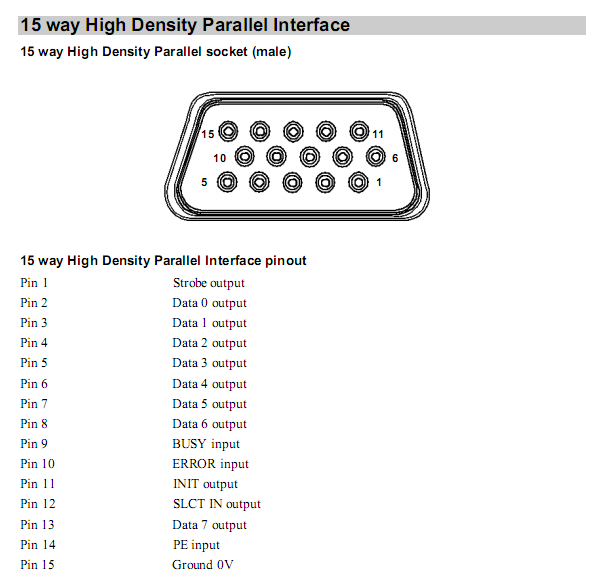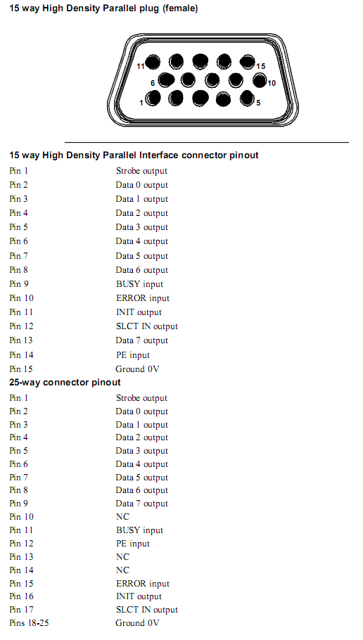 Pinouts can be found in excerpts from technical manual: Serial port, Parallel port, 15-to-25 converter specs, its pinout.