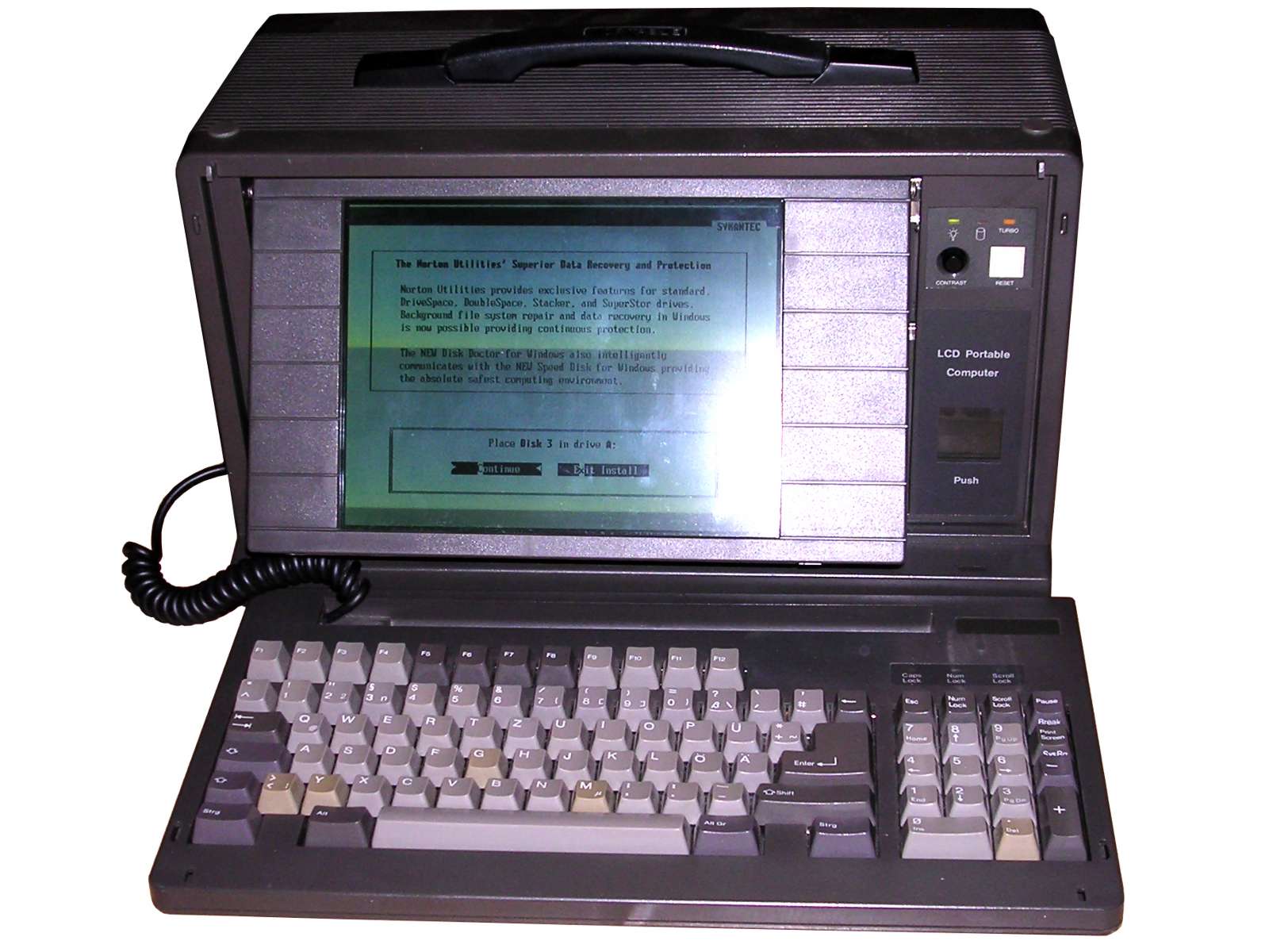This portable PC fits in a very specific form factor, being a small briefcase with detachable keyboard, screen in front and drives on one side. Although Compaq Portable III - the first widely spread machine of this form factor, was released around 1987, the "briefcase" design itself turned to be more resilient than its original machine. Similar machines were seen in markets even in mid-1990s, mostly marketed as "Heavy-duty" or "industrial programming" machines. This 386-based computer is from 1992.