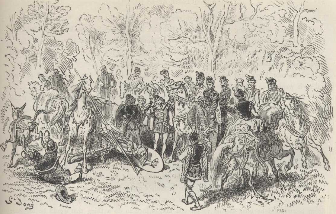 Sancho went off at top speed, forcing Dapple out of his regular pace, and came to where the fair huntress was standing, and dismounting knelt before her and said, "Fair lady, that knight that you see there, the Knight of the Lions by name, is my master, and I am a squire of his, and at home they call me Sancho Panza. This same Knight of the Lions, who was called not long since the Knight of the Rueful Countenance, sends by me to say may it please your highness to give him leave that, with your permission, approbation, and consent, he may come and carry out his wishes, which are, as he says and I believe, to serve your exalted loftiness and beauty; and if you give it, your ladyship will do a thing which will redound to your honour, and he will receive a most distinguished favour and happiness."