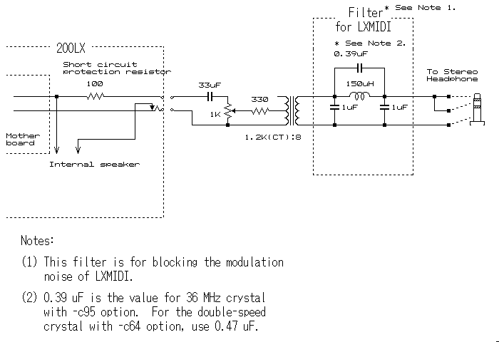 The internal speaker of the HP 100/200LX is fine if used for Appointment Book alarms and simple beeps. But software programs are available that let users play music on the Palmtop. (One such program is LXMIDI =, a software MIDI synthesizer for the 200LX). For such uses, higher quality sound reproduction is desirable. This is why some Japanese users have added an receptacle for an external earphone to the 100/ 200LX. The receptacle generally is situated on the side of the Palmtop with the PC card slot, just below the hinge. The circuit diagram for adding an earphone jack is shown above. You may want to add a filter to kill the base noise (modulation frequency) of LXMIDI, when you use the external earphone.